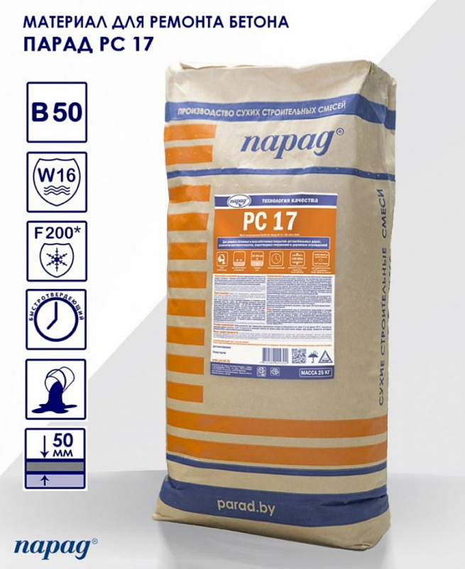 Парад РС 17 — готовая сухая ремонтная смесь для приготовления безусадочного быстротвердеющего высокопрочного материала консистенции от пластичной до литой, применяющегося при ремонте бетонных покрытий дорог, аэродромов, парковочных зон и мостов и т.д.