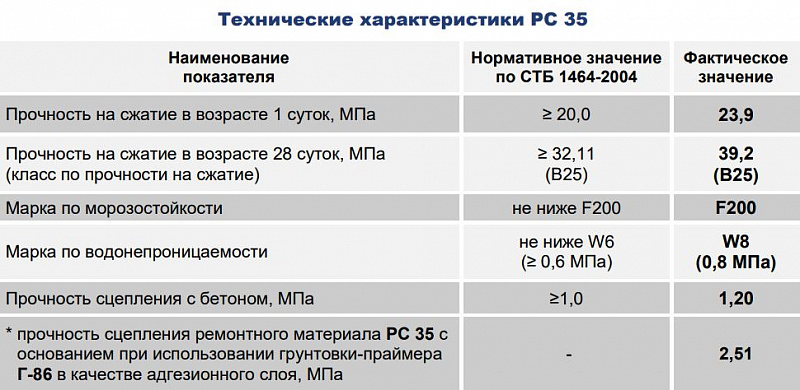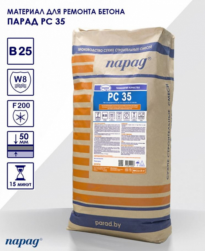 Парад РС 35 — безусадочная сухая ремонтная смесь на алюминатных вяжущих для аварийного ремонта бетона (время схватывания – 5 минут). При затворении водой образуется быстросхватывающийся и быстротвердеющий состав, характеризующийся высокой скоростью набора прочности (показатель прочности на сжатие не менее 23,9 МПа в возрасте 24 часов), отсутствием трещинообразования, морозостойкостью и водонепроницаемостью, высокой адгезией к ремонтируемым поверхностям.