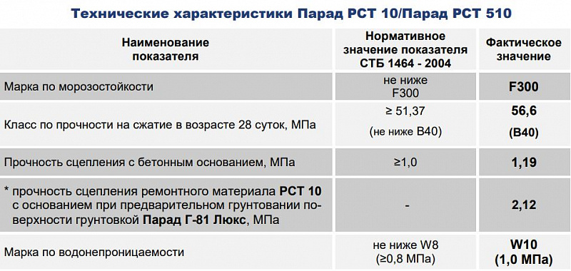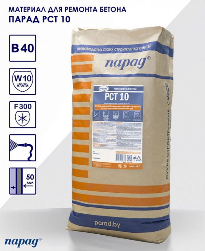 Парад РСТ 10/РСТ 510 — готовая сухая ремонтная смесь для приготовления безусадочного быстротвердеющего ремонтного материала. Содержит фракционированный заполнитель крупностью 2,5 мм, расширяющий модификатор для компенсации усадочных деформаций и регулирующие добавки, контролирующие расширение для обеспечения высокой прочности сцепления ремонтного материала и ремонтируемой конструкции.