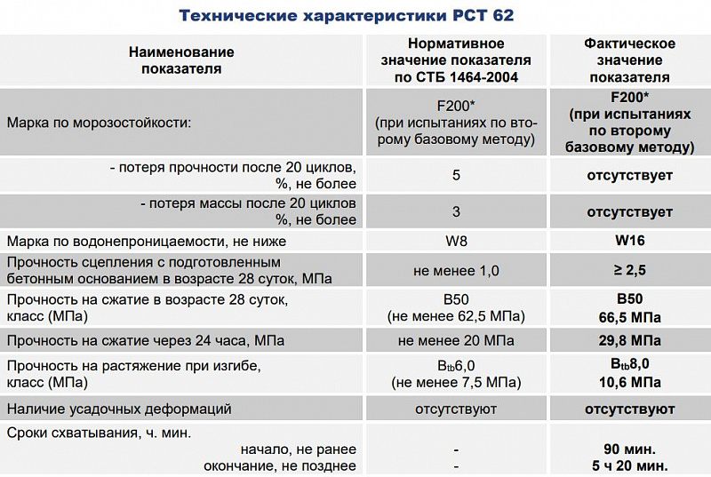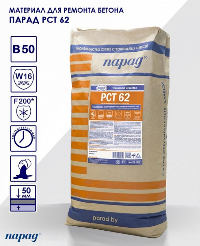 Парад РСТ 62 — готовая сухая ремонтная смесь для приготовления быстротвердеющего высокопрочного материала с компенсированной усадкой, применяющегося при ремонте бетонных покрытий дорог, аэродромов, железобетонных элементов мостовых и водоотводных сооружений, дорожных ограждений, парковочных зон и т.д.