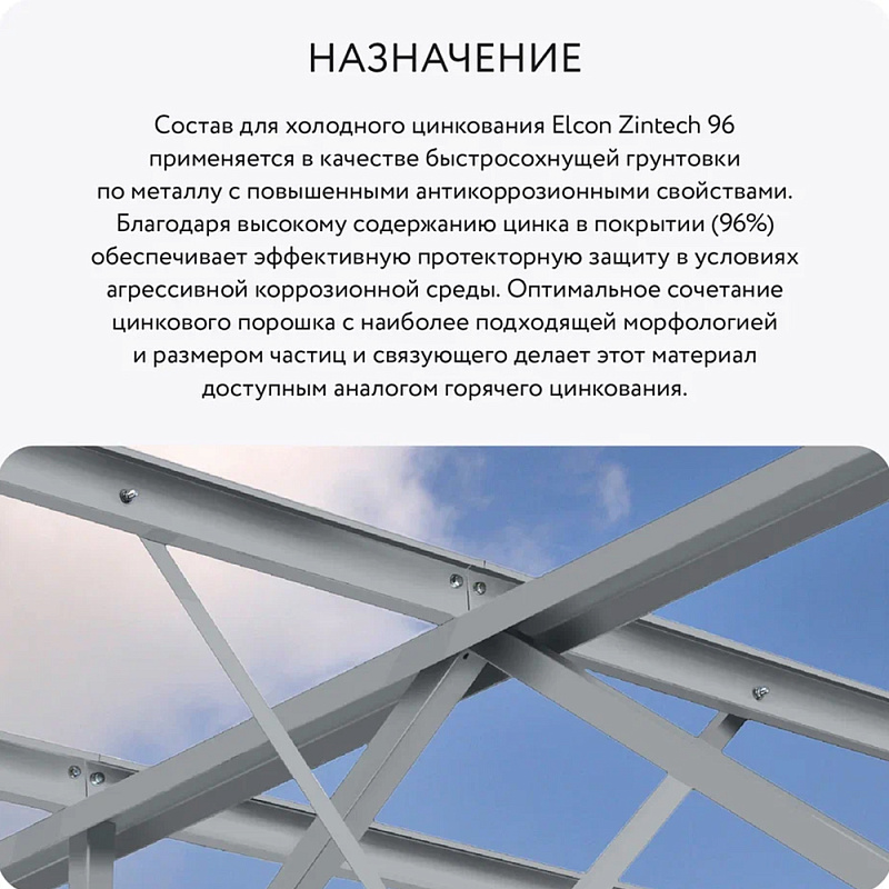 Elcon Zintech 96 предназначен для антикоррозионной протекторной защиты стальных изделий, конструкций, эксплуатируемых в различных типах атмосферы всех климатических районов. Может использоваться как самостоятельное покрытие, а также как грунтовка под финишные покрытия для создания комплексной системы защиты. Благодаря высокому содержанию цинка в сухой плёнке (96%) покрытие обеспечивает эффективную протекторную защиту в условиях агрессивной коррозионной среды.