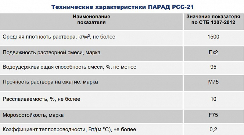 Парад РСС-21 — модифицированная сухая смесь для приготовления легкого (теплого) раствора для выполнения кладки из блоков ячеистого бетона. Применение теплого кладочного раствора позволяет избежать мостиков холода и создать однородную конструкцию при соблюдении требуемой толщины шва.