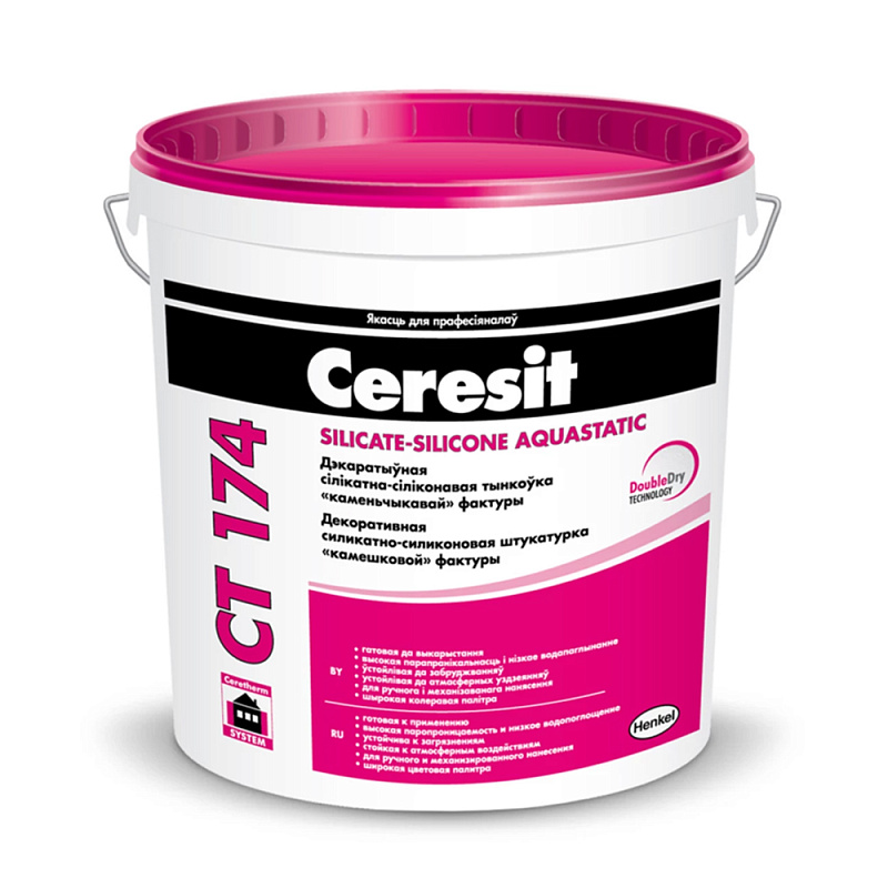Силикатно-силиконовые декоративные штукатурки Ceresit CT 174 с фактурой «камешковая», СТ 175 с фактурой «короед» применяются на вертикальных минеральных основаниях (бетон, штукатурка, армировочный слой по утеплителю) внутри и снаружи зданий. Штукатурные покрытия по плитным основаниям (ДСП, ОСБ, ЦСП, гипсокартон, гипсоволокно и т. п.) можно выполнять только внутри зданий.