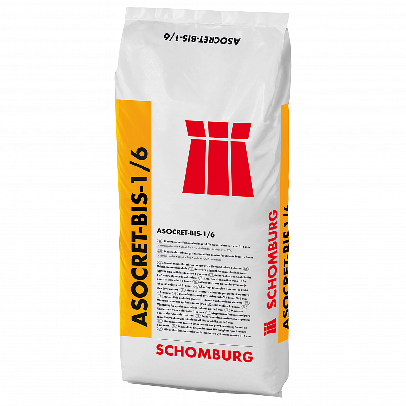 ASOCRET-BIS-1/6 наносится на подготовленное основание предварительно "царапающим" шпаклеванием с последующим нанесением слоя требуемой толщины. Выравнивание осуществляется подходящим инструментом (гладилкой, кельмой и т.п.) в течение времени применения. По истечении соответствующего времени выдержки поверхность можно затереть фетровой или губчатой тёркой.