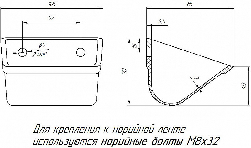 Болт норийный М8х32 - 2 шт., Гайка М8 - 4 шт., Шайба плоская увеличенная - 2 шт. |